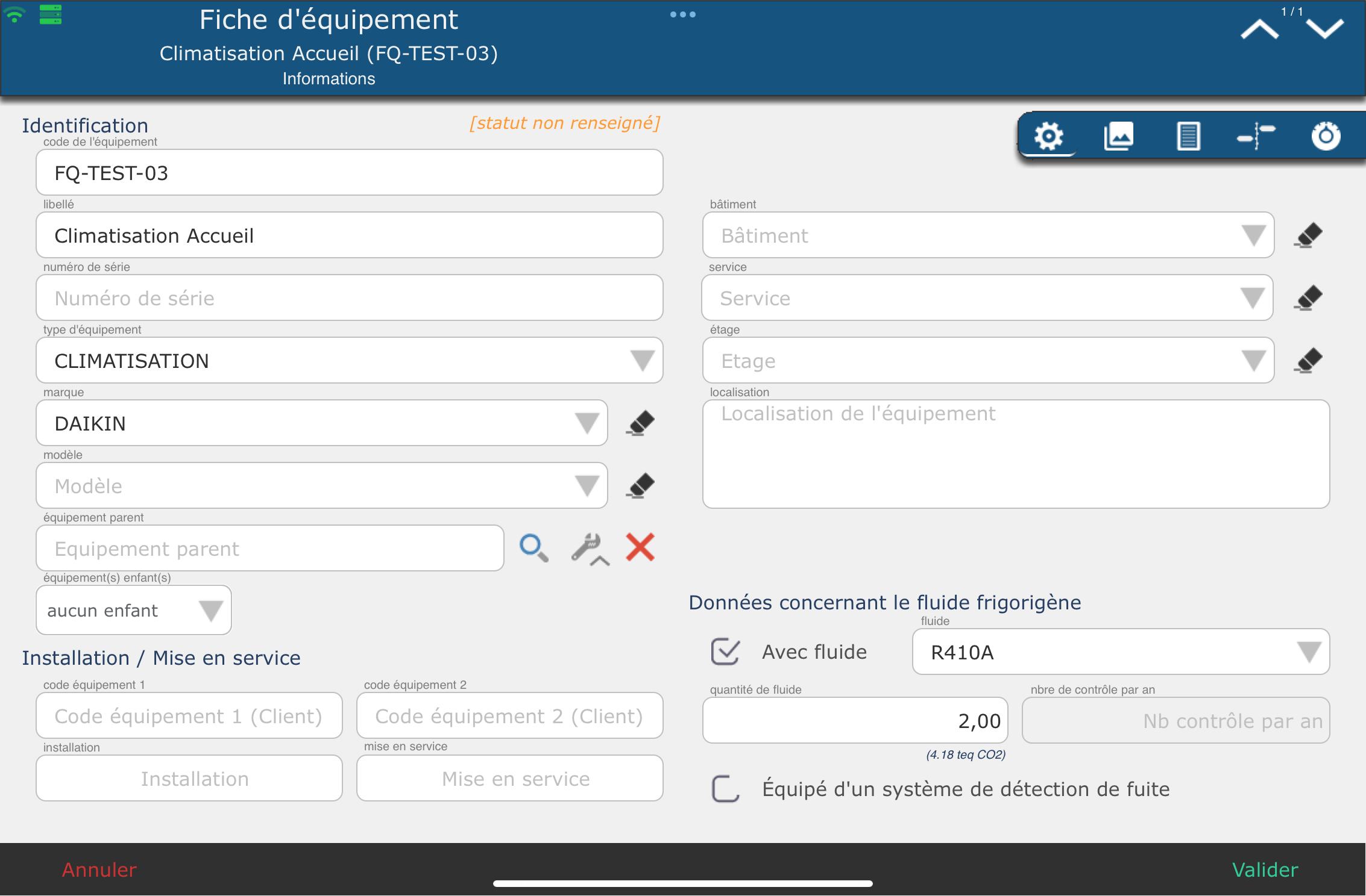 La gestion des équipements permet de visualiser la liste de vos équipements et de voir rapidement si les maintenances et les contrôles ont été effectués. Il est possible de visualiser la fiche complète des équipements avec toutes les informations utiles mais également les photos, l'historique des interventions, les relevés…
